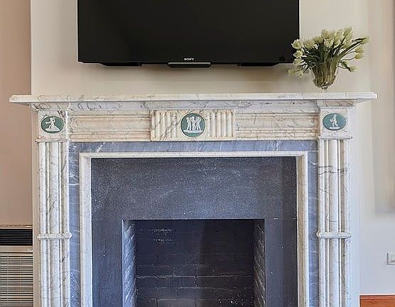 The living room and bedroom are drenched with sunlight and adjoined by paneled cherry wood folding doors allowing for the use of an open floor plan. The bedroom is centered by a beautiful Neoclassical marble wood burning fireplace and has an ensuite bath.