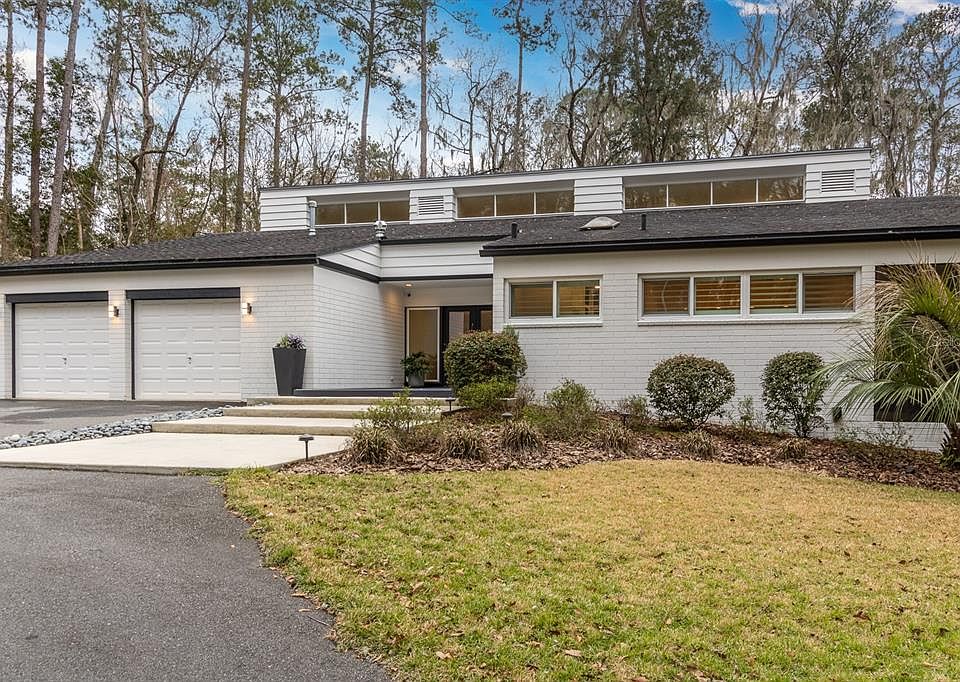 Welcome home to this stunning Mid Century Modern on 2.47 acres close to HCA hospital, restaurants and shopping. This home constructed with Ocala block in 1968, has been recently restored and remodeled with an appreciation for the iconic architecture and design of the period and boasts an impressive 3,590 square feet of living space, 5 bedrooms, 3.5 baths, two large family rooms - one with original block wood burning fire place, the other with a dry bar and wine refrigerator. Both are awash in natural light from the walls of windows that open out to decks and patios for all of your outdoor entertaining and relaxing needs. The primary bedroom has a screen porch with hot tub and an en-suite with double vanity, walk in shower, and IKEA closet systems. The other four bedrooms have brand new plush carpeting, Pecky cypress walls, and share two hall baths - one with tub/shower combo, the other has a walk in shower. Every room in this home brings the outside in through large windows or sliders including the laundry room complete with quartz counter tops, laundry sink, second refrigerator and high gloss cabinetry. The kitchen is the starting point for the high gloss cabinetry, quartz with mother of pearl waterfall counter tops, stainless appliances, a six burner gas Thor Kitchen stove with griddle and double ovens and a built in table with Royal Blue microfiber benches. Off the kitchen is another screen porch. The outdoor spaces are just as impressive as the inside featuring a raised deck down to an open patio with fire pit. Up the hill is a salt water, fiberglass in ground pool with a large entertaining area covered by sun sails for some filtered shade on those hot afternoons. Don't miss your chance to own a piece of Mid Century Modern history, updated with all the amenities and functionality that today's Buyers desire.
