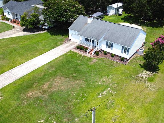 Extremely well-maintained, one-owner Ranch Home with charming curb appeal! This gorgeous Rocking Chair Front Porch home offers a warm and inviting Living Room featuring durable LVP flooring and a cozy Gas Log Fireplace with a blower for added comfort. The Kitchen is sure to impress with Granite Countertops, Glass Tile Backsplash, Pantry, Breakfast Bar, and Stainless Steel appliances included. The spacious Master Bedroom includes a private en-suite with a single vanity and tub/shower combo. Two additional freshly painted Bedrooms—each with ceiling fans—provide ample space and comfort. Step outside and enjoy relaxing evenings or weekend cookouts on the back deck, perfect for entertaining family and friends. The Fully Fenced-in Backyard is ideal for kids and pets to play safely and also includes two storage buildings: one wood shed and a large 16x32 Metal Shed with a roll-up door. Additional perks include a Kitchen Refrigerator, TV Mount, and RING Doorbell and Camera—all conveying with the home. Conveniently located near SJAFB, Hwy 70, shopping, and local amenities.