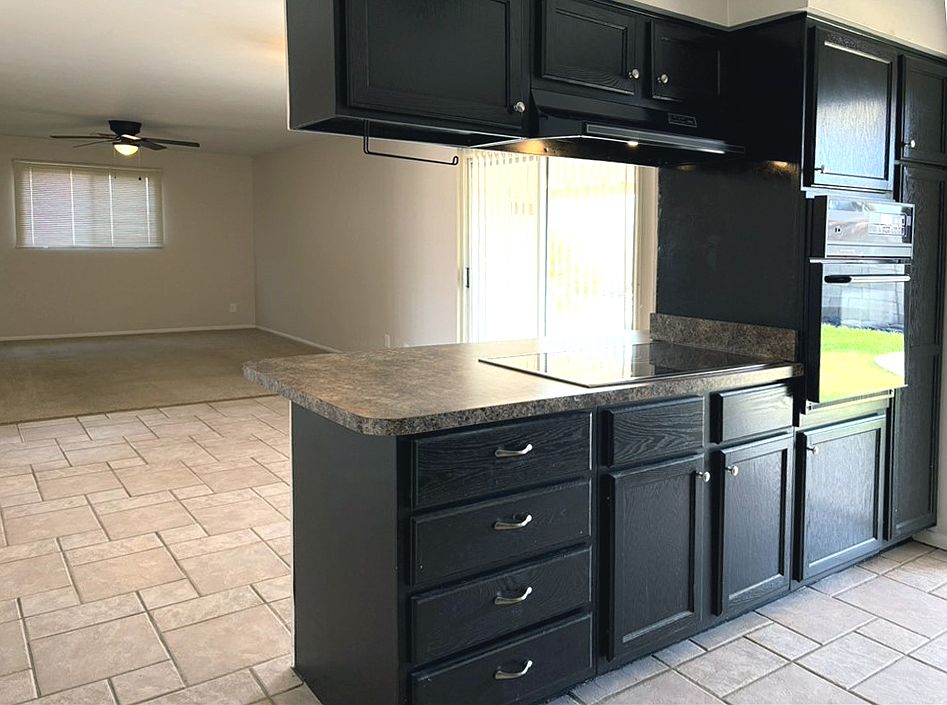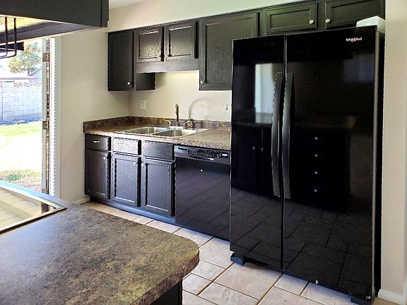 Large covered patioEspresso cabinetsLaundry roomNice tile flooringCeiling fansBlack appliances