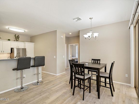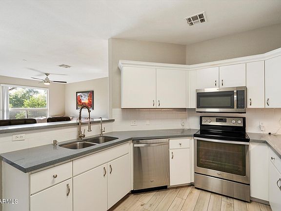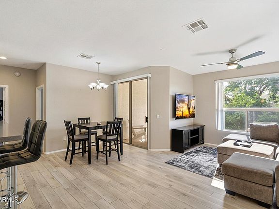 This stunning Scottsdale condo features designer upgrades throughout, including wood-plank tile flooring, neutral paint, and modern lighting. Bright, open concept living with quartz countertops, subway tile backsplash, white shaker style cabinets with crown molding, under/over cabinet lighting, stainless steel appliances, RO system, and breakfast bar. Private balcony surrounded by trees, accessible from the primary suite and dining area. Spacious primary suite with double sinks and a gorgeous tiled walk-in shower with barn-style glass doors. Smart Nest thermostat system with voice-activated lighting and ceiling fans, separate detached 1-car garage, newer AC, and roof. Prime Scottsdale location close to restaurants, shopping, and entertainment.