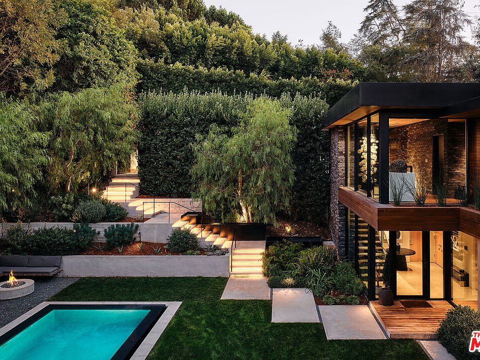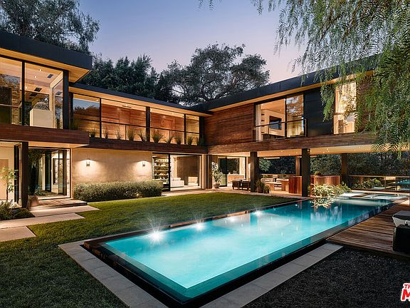Nestled within the prestigious gated enclave of Oak Pass Road in Beverly Hills, this 5,442-square-foot modern sanctuary embodies a rare synergy of architecture and nature. Positioned on a peaceful .32-acre lot, this 3-bedroom, 5-bathroom retreat offers a secluded haven with panoramic canyon and hillside vistas. Thoughtfully crafted with wood, stone, glass, and fire elements, each room welcomes the outdoors through expansive floor-to-ceiling glass, creating a zen-inspired atmosphere for ultimate relaxation.The home's L-shaped design and sculpted landscape enhance privacy, embracing the surrounding natural beauty. A dramatic two-story atrium fills the space with light and greenery, complemented by floating fire features and suspended gardens that deepen the sense of calm. Flowing seamlessly from the formal dining room, the open living area connects to an expansive kitchen with dual sided fireplace, that opens to the outdoor covered lounge area for effortless entertaining. The primary suite appears to float above a saltwater infinity pool, offering breathtaking views, while two guest suites rest under the canopy of a majestic 100-year-old oak tree.Terraces along the property reveal sweeping views of the private backyard and surrounding mountains, with an inviting spa and lounge area designed for alfresco dining and gatherings. A dedicated gym and wellness area, private studio/office, theater room, and an outdoor kitchen with a fire pit complete this residence, a true celebration of refined, tranquil living in an extraordinary setting.Oak Pass Road is an exclusive gated neighborhood in Beverly Hills Post Office situated west of North Beverly Park, with only 42 private residences offering unparalleled access to the shopping, dining and nightlife of Rodeo Drive and the iconic Beverly Hills Hotel. Simo Designs.