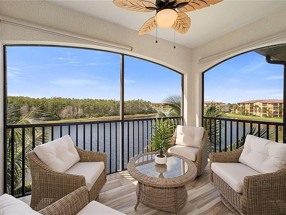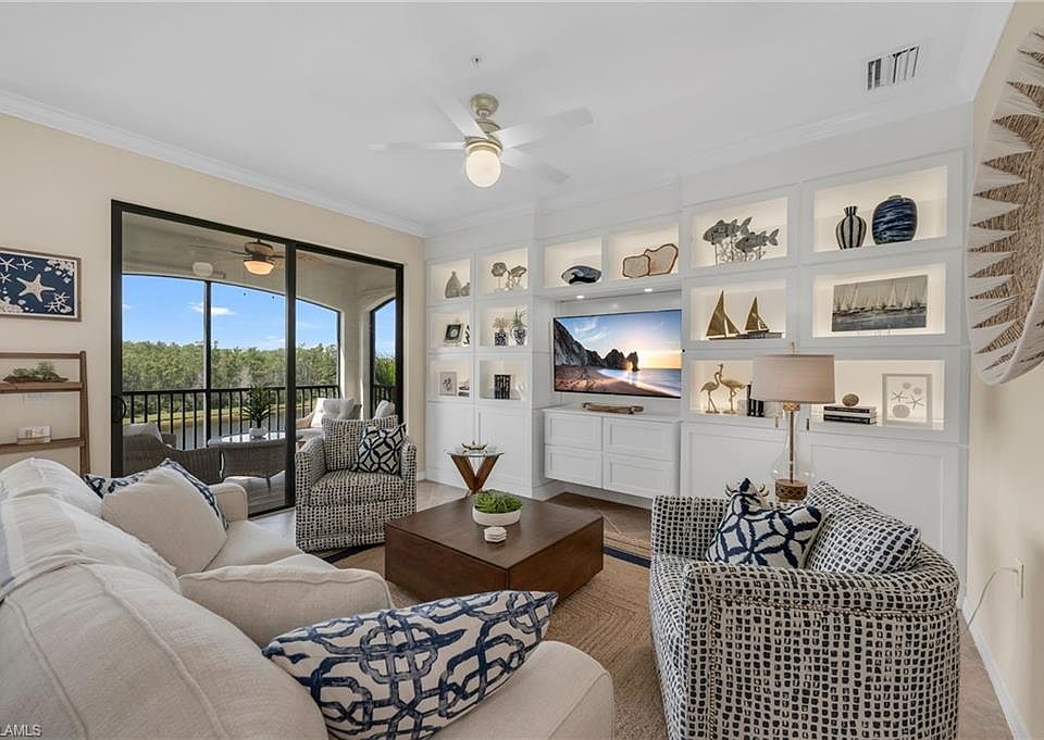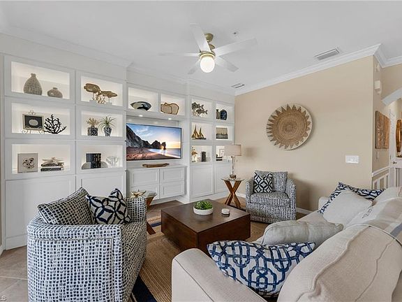 Stunning long lake views in Treviso Bay! This immaculate TOP-FLOOR BELLINI FLOOR PLAN offers a beautifully upgraded design with turnkey furnishings. The 2-bedroom, 2-bath plus FLEX ROOM layout showcases crown molding, custom built-in wall cabinetry with hidden big-screen TV, upgraded ceilings and lighting, plantation shutters, and a designer-tiled lanai for enjoying the best southwestern water views. The kitchen features stainless steel appliances, granite countertops, and breakfast bar seating. Additional perks include covered parking, extra storage, and no golf fees. Treviso Bay lives like a resort with first-class amenities: TPC golf course, clubhouse with fine dining, business center, library, social club, resort-style pools with waterfalls and bar & grill, lap pool, tennis, pickleball, bocce, fitness center, yoga studio, spa, sauna, and more. Just steps to a satellite pool, grilling area, and pickleball courts. Only 10 minutes to downtown Naples and beaches—Make this home your Florida home for the upcoming winter season!