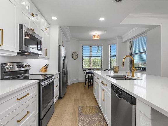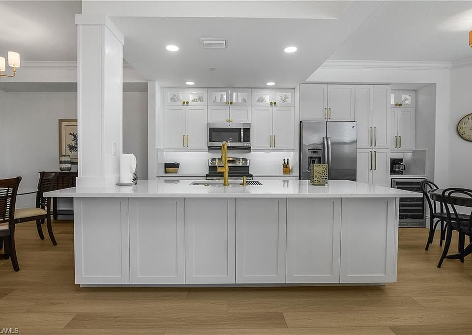 A rare chance to own PERFECTION—this 2nd floor, SOCIAL membership, Bellini model in Treviso Bay has been masterfully remodeled with more than $50,000 in upgrades, creating a home that feels brand new and effortlessly refined. Every detail has been considered, blending style and function into a welcoming retreat with 2 bedrooms, 2 bathrooms, and a spacious open layout perfect for everyday living or entertaining. The redesigned kitchen is the heart of the home, showcasing $20,000 in custom cabinetry from floor to ceiling, sleek quartz countertops, a large stainless-steel sink with upgraded faucet, Jeffrey Alexander hardware, and a built-in wine cooler and dry bar. A removed kitchen wall now creates a more open, airy flow, while designer chandeliers and enhanced electrical work provide an elegant finishing touch. Luxury vinyl flooring stretches throughout, complemented by taller baseboards and wider door trim for a refined look. The living area is anchored by a stunning custom tile TV and fireplace feature wall, making it a perfect space to relax. Freshly painted walls, ceilings, and trim enhance the light and bright atmosphere, while an upgraded screen door at the entrance welcomes breezes inside. Even the laundry room has been elevated with additional cabinetry for storage and convenience. As a bonus, the contractor has a piece of matching quartz available should the new owner wish to upgrade the bathroom counters. The screened lanai has an updated light and fan and offers breathtaking views of the lake and Rookery Bay Preserve, perfect for enjoying a morning cup of coffee or relaxing after a fun filled day in the community. Beyond the home itself, Treviso Bay offers a lifestyle unlike any other in Naples. This gated community features the luxurious Club Rilassare with a resort-style pool, lap lanes, hot tub, kiddie pool, and poolside restaurant and bar. Stay active with a state-of-the-art fitness center, aerobics studio, bocce courts, tennis facilities, pickleball courts, and a half court basketball. Unwind at the full-service spa, explore miles of walking and biking trails, or simply enjoy the natural beauty surrounding the community. The main clubhouse over looks the TPC golf course (tee times available to social members May - October) and offers plenty of dining options with indoor and outdoor bars and seating, a large events room, private dining room, Arthurs Snack Shop, activities room, business center, a golf pro-shop, and large lounge locker rooms. With a social membership included, you’ll have access to endless opportunities to connect, relax, and enjoy the best of resort-style living.