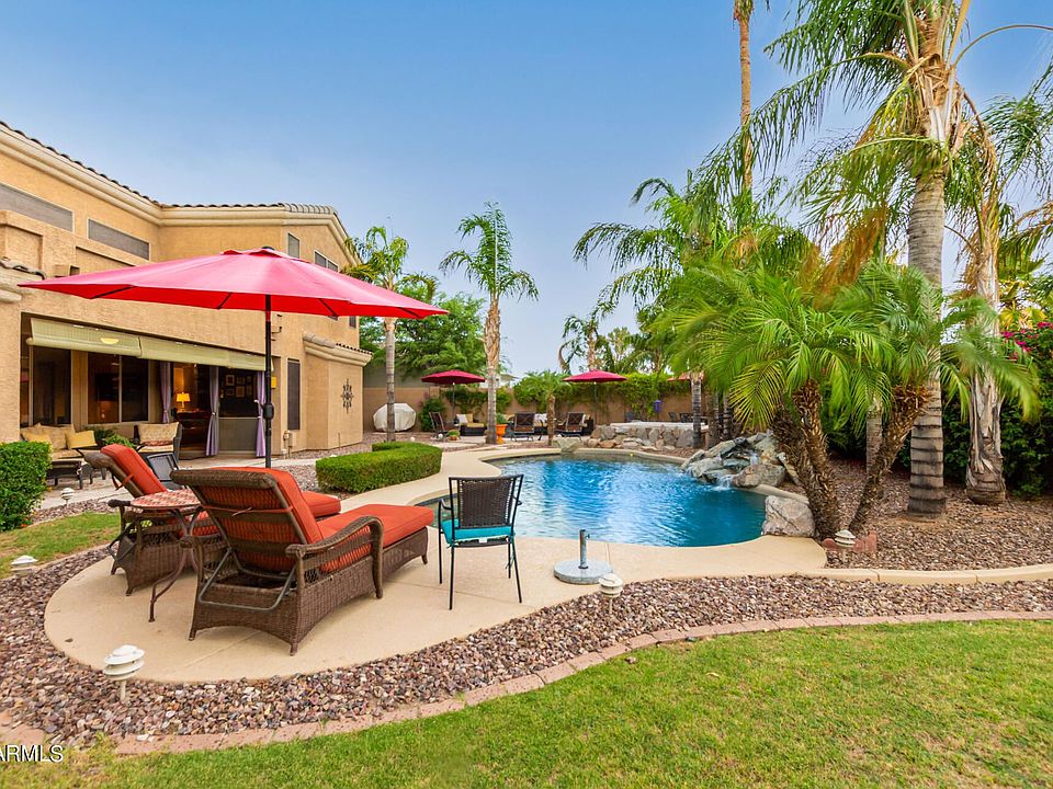 New AC installed 8/22 ! Beautiful golf course community! This 3661 SQ FT 4 beds, 2.5 baths home is located on an oversized lot w/gorgeous view of Superstition Mtns. W/ Mature landscape and a 3-car split garage. As you enter the home, you will find a formal living/dining area w/soaring ceilings, lots of natural light, & neutral carpet. Large kitchen with island/breakfast bar, a walk-in pantry, and tons of cabinet space, flows into the family room providing a perfect space to entertain. Huge loft space. Main floor large owner's suite boasts dual sinks, a separate tub/shower, and 2 walk-in closets. The resort-style backyard has a sparkling pebble tec pool w/waterfall, 8 person jetted, recessed spa, & covered/extended patio