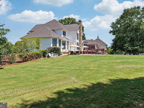 The Riesen Ranch is a remarkable 191+ acre cattle and equestrian estate, perfectly situated just one hour from downtown Atlanta. It boasts exceptional beauty while also serving as an income-producing livestock ranch and event venue. The custom-built main house was designed for family and entertaining. This 6-bedroom, 4.5-bath home offers 9,247 square feet of living space, including a fully finished 2,264-square-foot basement with a mother-in-law suite. The home showcases the finest craftsmanship and detail. A large front porch overlooks the pond and pasture. Inside, the grand foyer features a double bridal staircase with beautiful flooring, ceiling accents, and custom woodwork. It leads to a spacious living room with a fireplace and stunning views of the heated pool and pastures. The breakfast room, also with a fireplace, connects to a newly renovated kitchen. A large mudroom, ideal for farm life, leads to a large laundry room. At the front of the house, the formal dining room and office boast breathtaking pond and pasture views. The master suite includes a private study with a gas fireplace. The expansive master bath offers a glass shower, jacuzzi tub, and his-and-hers toilets. Upstairs, there are four bedrooms-two on each side of the home-joined by Jack-and-Jill bathrooms and a balcony overlooking the pond and property. The fully finished basement features a private mother-in-law suite with a kitchenette and separate entrance leading to a tea garden. Additional highlights include a home theater with custom sound, lighting, seating, and soundproof walls, as well as a secure gun room with keypad access, storage rooms, and ample closets. The home is equipped with a whole-house central vacuum system and a Generac emergency generator. Outside, there are two two-car garages. One is connected by a breezeway that leads to a large deck and heated pool overlooking the pasture. A 3,500-square-foot shop includes a finished office on one side and a music recording studio with a sound room on the other. The concrete-floored shop houses the family's gym and rock wall, with plenty of space for equipment and toys. It also features a tool room with a workbench, loft storage on both sides, and additional outdoor bays for storage. The property includes two horse barns. One with seven custom pine stalls, a feed room, tack room, storage closets, a hay loft with chute, fans, lighting, and an attached paddock for easy turnouts that lead to a large pasture. The second barn offers eight stalls with feed and tack rooms. Above it is a newly renovated 2-bedroom, 1-bath apartment with a full kitchen and large living area-perfect for hosting and entertaining. A riding arena and round pen provide space for equine training and exercise. The ranch also features a 10,000-square-foot elegant event space adorned with imported crystal chandeliers. It includes a commercial prep kitchen with stainless steel preparation station, refrigerator, and sink; three restrooms; a live-edge bar; and seating for up to 200 guests. Outdoor amenities include a stage and seating area, ideal for weddings, educational gatherings, and corporate events. The Riesen Ranch offers a gated entrance, a well-maintained road system, and trails throughout the property. Two 4,000-square-foot red iron open barns provide equipment storage. The property is fully fenced and cross-fenced, with multiple paddocks and pastures. Currently raising the family's Wagyu cattle and horses, the ranch offers tremendous opportunities for expansion into farm-to-table agritourism, given its close proximity to Atlanta. It has also been used as an equestrian boarding facility. It's ready for your cows and horses! The Riesen Ranch is located in Senoia, Georgia just 44 miles (47 minutes) from Hartsfield-Jackson International Airport and 54 miles from Atlanta.