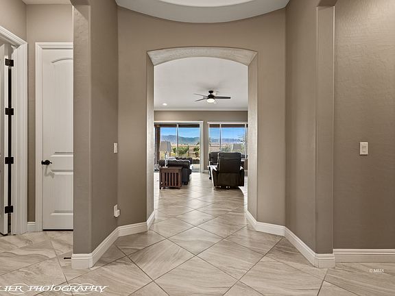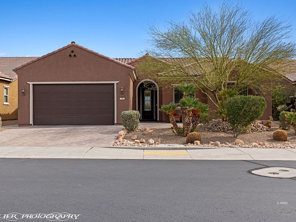 Pretty Pursuit , Upgrades Galore, Elevated View Lot. Discover exceptional living in this meticulously maintained 2-bedroom, 2.5-bathroom home.This thoughtfully designed Pursuit model showcases premium upgrades throughout, creating an ideal retreat for discerning buyers. The front yard features an elegant pavered seating area, perfect for morning coffee or evening cocktails while watching spectacular Mesquite sunsets Professional landscaping , extended paver walkways, & fully fence yard enhance the property's impressive curb appeal, leading to a stunning upgraded front entrance.Inside, the versatile floor plan flows seamlessly The gourmet kitchen serves as the home's centerpiece, with rich espresso cabinetry with pantry extensions, premium appliances, & gorgeous quartz countertops. The primary bedroom offers a unique feature with its private backyard entrance, creating a personal sanctuary. The guest bedroom, spacious den, & guest/half baths are in a separate hallway. Mountain/mesa views grace multiple living spaces. Garage has epoxy, 6' extension with work bench & aux door. Outdoor trash can enclosure. Nearby amenities including pickleball facilities & recreation facilities. Embrace year round sunshine & leave winter behind