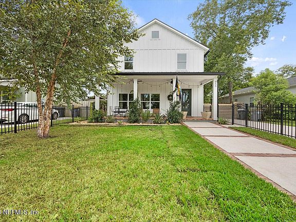 *OPEN HOUSE SATURDAY 11/08 11-1PM*. Spectacular Modern Farmhouse Retreat near Jacksonville's Avondale/Riverside areas. This 4BD/3BA, 2,555+ Sq Ft Home was Built in 2020. Discover the perfect blend of coastal elegance and everyday comfort in this stunning 2020-built modern farmhouse, nestled just a few blocks from Edgewood Avenue's vibrant shopping and dining scene. Spanning over 2,555 square feet of thoughtfully designed living space offers an open floor plan that invites seamless entertaining and relaxed family living. Zoned for the top-rated Ruth N. Upson Elementary (an A-rated school), it's an ideal retreat for growing families or discerning professionals seeking walkable urban charm with suburban serenity. Step onto the inviting front porch paved in classic clay pavers, where a 220V connection is already wired in for your EV charger. The black 7'' seamless gutters and horizontal wood fencing in the backyard (paired with sleek black aluminum fencing out front) add timeless curb appeal and low-maintenance privacy. Around back, the covered porch extends your outdoor oasis with clay pavers and a remote-controlled retractable awning perfect for al fresco dinners or shaded lounging. A handy 8x10 shed provides ample storage, while lush landscaping frames the scene.