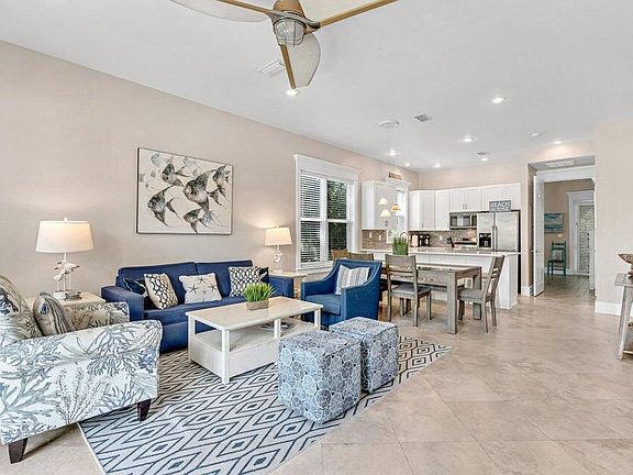 Now offering a $15,000 credit to buyer at closing! First floor living with front door parking makes this rental perfect for all ages. Offered fully furnished and turnkey, this spacious townhome features 4 large bedroom suites and 4 full baths, plus hallway bunks and a sofa bed. Plenty of room for everyone to spread out and relax. The first floor offers a convenient bedroom and full bath, ideal for guests or multi-generational stays. The remodeled kitchen shines with quartz countertops, white wood cabinetry, and stainless steel appliances. Each bathroom features tile surround walls, and the two master suites boast separate showers and soaking tubs for ultimate comfort. Tile and wood flooring throughout adds to the clean coastal vibe. Spacious 2200+ with room to breathe. Enjoy community perks like a large pool right outside your door and deeded, gated beach access just across the street.