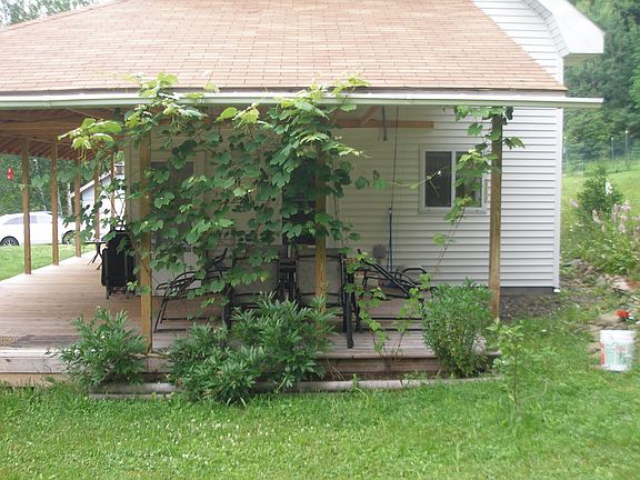 Well kept home (and very clean) located on a 2 acre manicured lot. French doors lead to large entry way with lots of custom cabinets & closets for storage. New 11 x 19 den (or first floor bedroom). Open floor plan for living room, woodstove, adjoining dining area and kitchen with plenty of cabinets and all appliances including stove with microwave, refrigerator & built in dishwasher. First floor bath with newer washer & dryer. Heated ceramic tiled floors for those cold winter nights. On the second floor is a huge bedroom with gleaming hardwood floors. It can easily become two bedrooms, if needed. Lots of closet space and a full bath. Covered wrap around deck for enjoying the outdoors. You're going to love the newer 12 x 15 building with an 8 person HOT TUB with attached screened porch. 16 x 24 garage, vinyl siding, metal and shingled roof. GORGEOUS perennial garden, spring fed pond with bass. Propane hot water baseboard heat. Great hunting in area you can walk to the 2956 acres of State lands.Not far from town and Rte 17/I-86 for easy access. You're going to want to take a look!