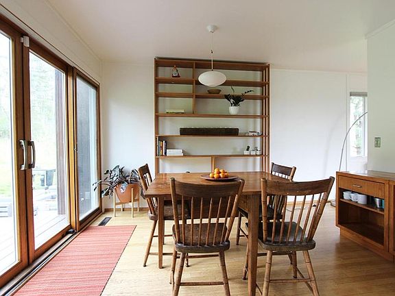 This 3 BR, 2 Bath Modernist masterpiece on 3.63 acres is surrounded by views was designed by architect Robert Gatje, a partner of Marcel Breuer. Original design carefully preserved & enhanced with: geothermal heating & cooling, grid-tied solar panels, high-performance Pella windows & Level II charging station for your EV. Average utilities only $67/month! This Breuer-inspired home has a concrete rectangular form, open plan, walls of glass, cypress wood, slate, maple floors & classic Breuer brick hearth. Well-designed Kitchen with work triangle features original checkerboard floor, original cabinets & tile backsplash. Primary suite. Original rhombus tile in Bath 2! Walls of glass & changing views create a feeling of spaciousness. Wonderful outdoor spaces include decks & flagstone patios. Two apple trees, a strawberry patch, herb garden, vegetable garden, rain garden with pussy willows & more. Just 9 min to Cornell & East Hill Plaza. A place that will grab your heart.