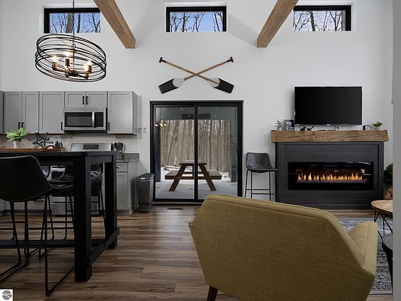 Come enjoy a newly built, stylish 2 bedroom, 1 full bath cabin at the world's 6th most beautiful lake, Higgins Lake! Built new in 2022, this cabin features an open concept with vaulted ceilings, modern finishes, and large windows providing seasonal glimpses of Higgins Lake. In addition to the comfortable living spaces, there is a foyer entry with storage, designated laundry, and an expansive covered porch stretching the entire width of the home, providing an excellent space for al fresco dining with gorgeous nature views. An established vacation rental, this unique cabin is located .25 mile from road-end lake access and is adjacent to a walkable nature preserve, hosting many native species of wildlife. There's endless miles of ORV and snowmobile trails, two outstanding state parks, bike and walking trails, the mighty Au Sable river nearby and more. Roscommon County is ORV "friendly" and allows golf carts and ATV's. A true recreational paradise!
