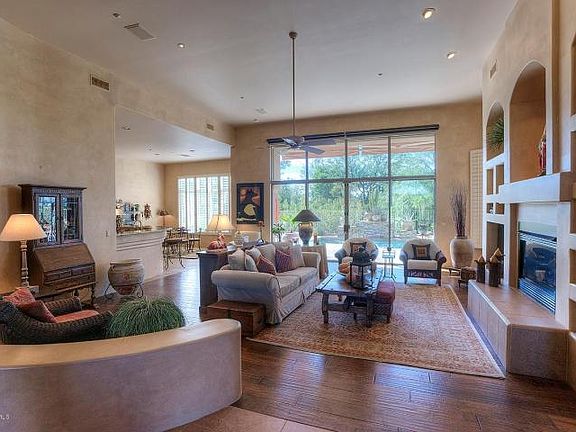 You will LOVE this stunning Edmunds built home in the gated community of The Monument Golf Course at Troon North. Comfort and luxury describe the ambiance of this lovely home. Inside, the split floor plan features tall ceilings, open greatroom with cook's kitchen overlooking amazing, outdoor living space with fireplace and outdoor kitchen, censored retractable awnings and drop down electric shade screens to beat the summer heat. NAOS to the west provides added privacy. A total of 3400sf, complete with 3 bedrooms plus a bonus room & den/office; finishes include wood & stone-look floors, shutters throughout, cedar interior doors, built-ins in office makes working from home a delight, 3 gas fireplaces, inviting owner's suite with sitting area and Jacuzzi tub, 3G with cabinets and epoxy floor,