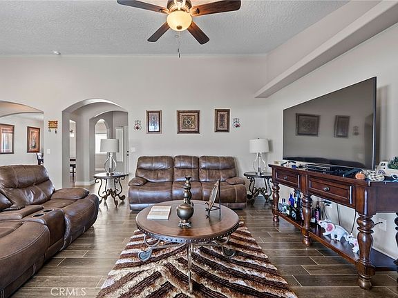 The expansive primary suite includes a luxurious walk-in shower, dual sinks with a centered vanity, and a large walk-in closet with custom shelving. Wood-look tile floors flow throughout the home, adding warmth and elegance to every room. Additional highlights include an oversized three-car garage, an indoor laundry room with ample storage, and an Alumawood covered patio—perfect for enjoying summer BBQs and outdoor gatherings.