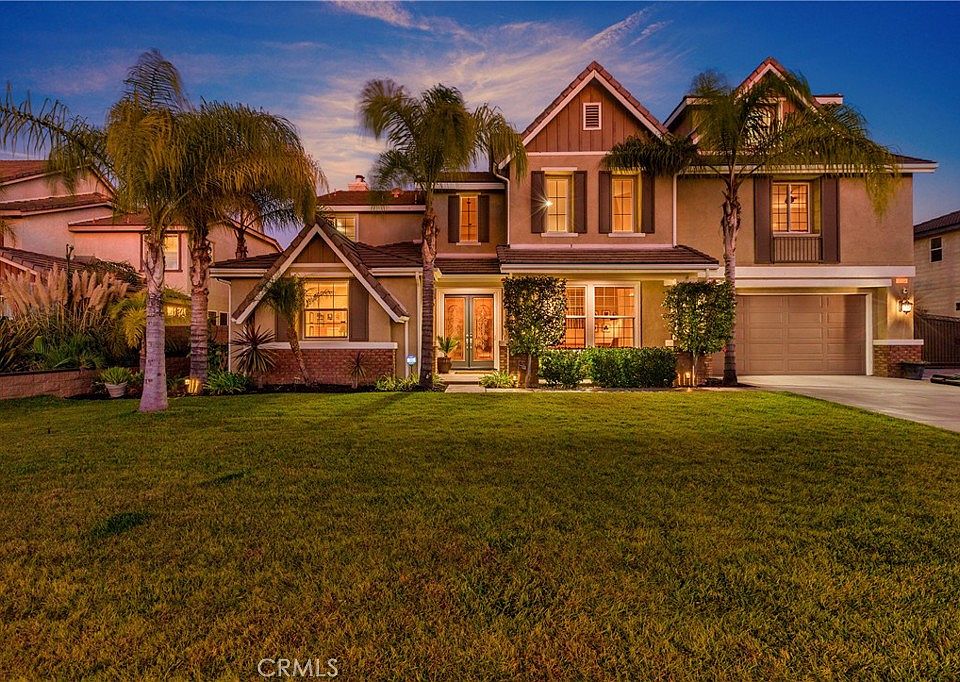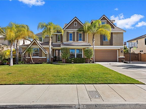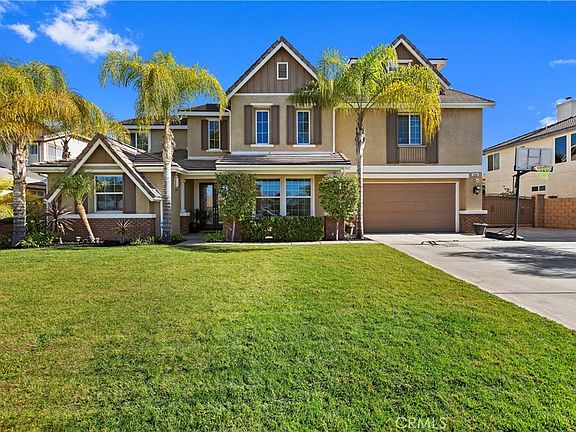 This beautiful Executive Style home with a 4 car tandem garage was built in 2004 and has been lovingly updated for the most discriminate buyers. Beautiful glass double front doors lead you to a sunny formal living room and beautiful entry. This open floorplan has a private guest suite with it's own bedroom and bath. Large formal dining room can double as a pool table room as shown in pictures. Kitchen has been replaced in the recent past with all new cabinets, counter tops, and plumbing and light fixtures. Kitchen includes a double oven, a 6 burner gas stovetop, refrigerator, built in microwave, dishwasher, island prep sink, dishwasher and walk in pantry. Family room is large with a beautiful fireplace and views of the pool/yard outside. This home has 4 more bedrooms on the 2nd level, including the large primary room with retreat, dual sided gas fireplace, walk in closet, dual vanity area with a large soaking tub and a separate shower. Mirrored wardrobes in all large secondary bedrooms. There is a large bonus/loft area on the 3rd level perfect for working or schooling from home or a private entertainment area for the kids. Flooring has been replaced throughout with beautiful laminate. Additional interior benefits include newer paint, newer thermostats, surround sound speakers in the family room and master bedroom and security system with cameras and retractable screen door. Exterior features include an updated salt water pool and spa, a variable speed pump, pebble tec and water slide, patio cover, BBQ island with grill and fire pit, gated RV parking with dedicated 30 amp circuit, dog kennel area and updated AC condensers. Property includes a leased Tesla Solar System and 220V wiring for charging station. There is a new community park and easy access to the 215 FWY. With highly rated schools nearby, this home is an excellent choice. Reach out to schedule your appointment today!