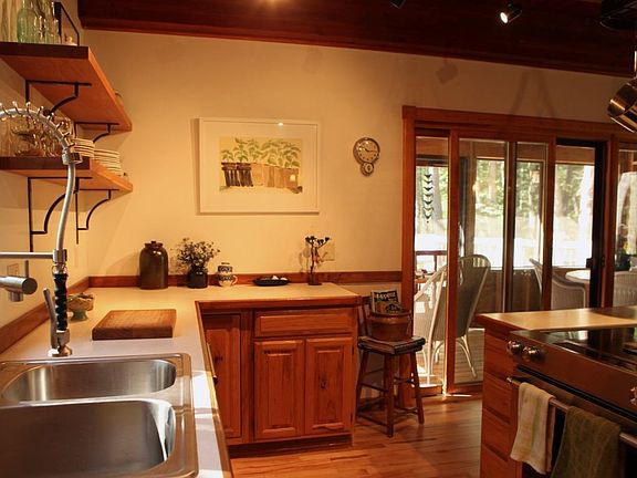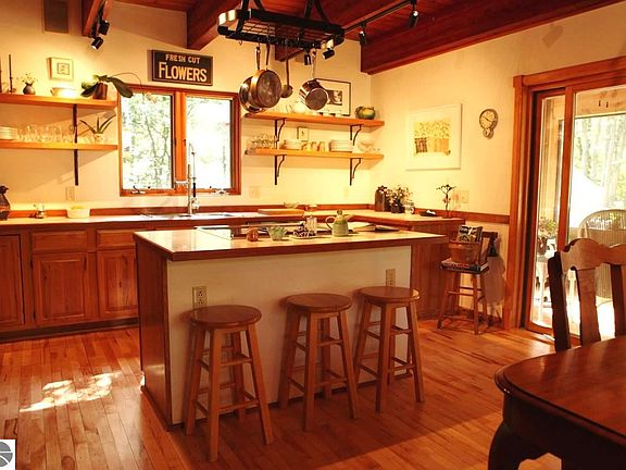 Breathtaking lodge style house tucked in the woods on 10 acres, yet close to lakes and Interlochen Arts Academy. State of the art house with privacy and wildlife aplenty -- a nurturing atmosphere for creativity or gatherings with family and friends. A wonderful floor plan, from the master suite and guest suite to wandering rooms -- plus a screened porch as well as outdoor decks and patio. Huge living room has hickory floors, beamed ceiling, cozy reading nooksa nd a grand fireplace & a great view. Island kitchen w/ new high end stainless steel appliances, dining are attached to the screened porch with is ideal for entertaining. Three spacious bedrooms are upstairs. The master is a true retreat with a private balcony overlooking the woods. A one of a kind craftsman home with gorgeous details at every turn! In a fabulous location.