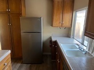 The kitchen boasts ample cabinet space and newer appliances, ideal for home chefs. Step outside to a large, fenced private patio perfect for relaxing or entertaining with a separate laundry room and extra storage.
