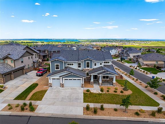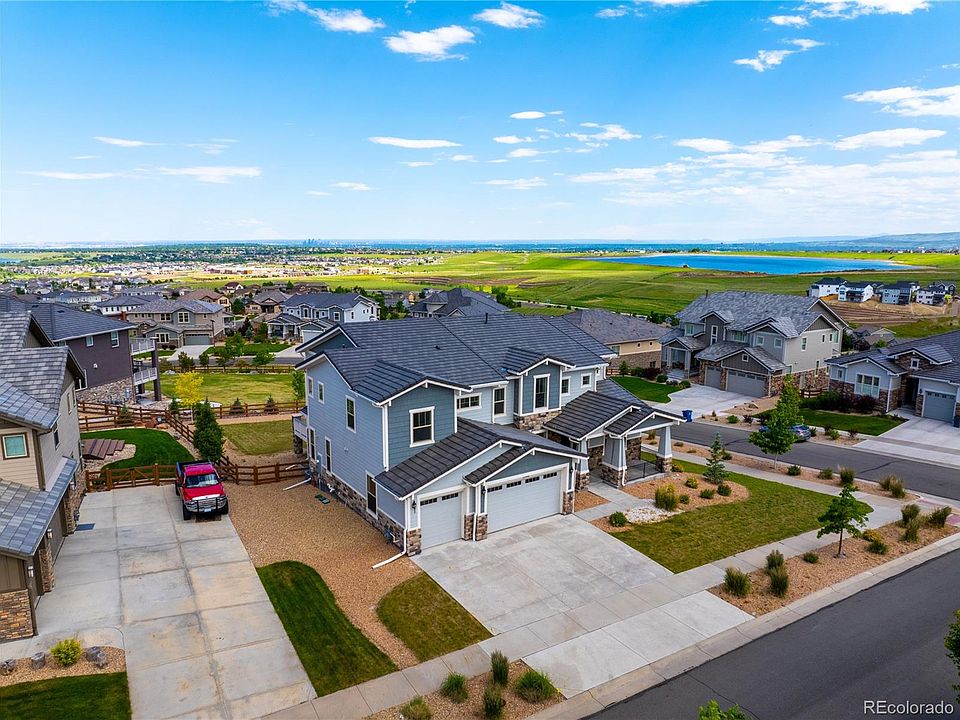 Welcome to one of the most desirable addresses in Candelas—Poppy Way, where this stunning Toll Brothers home offers unobstructed panoramic views of Standley Lake, the Denver skyline, and the Rocky Mountains. Situated on a premium .35-acre double cul-de-sac lot conveniently located next to the trail head, this fully refreshed residence is an exceptional blend of sophistication, space, and scenery. Step into a dramatic two-story foyer with a sweeping circular staircase that sets a refined tone. The home has been thoughtfully updated with new carpet throughout, fresh interior paint, and updated lighting fixtures that elevate every room. The gourmet kitchen impresses with an oversized 8-seat island, gas range, walk-in pantry with power outlet, and custom wine rack, opening to a sun-filled dining area framed by seven windows. The expansive great room features a two-story wall of windows, gas fireplace, and disappearing pocket doors leading to a covered deck—perfect for entertaining with breathtaking views. The main level offers flexible living with a formal dining/family room, a private office with mountain views, a guest suite, and a mudroom/laundry area. Upstairs, the primary suite is a private retreat with a sitting area, two walk-in closets, a spa-inspired five-piece bath, and a private deck to enjoy peaceful mornings. Two additional bedrooms, both with walk-in closets, a full bath, and a loft provide space and comfort. The walk-out basement offers endless potential, fitted with pre-plumbing and climate control, and the fenced backyard is ideal for enjoying the outdoors. Enjoy Colorado sunsets from the front porch and sunrises from any of the three decks. Located in the amenity-rich Candelas community with pools, trails, parks, sports courts, and top-rated Three Creeks K–8 School just minutes away. This is a rare chance to experience the very best of luxury Colorado living.