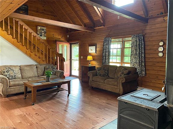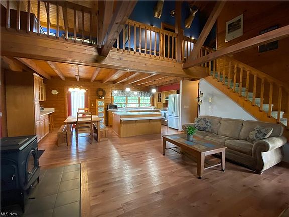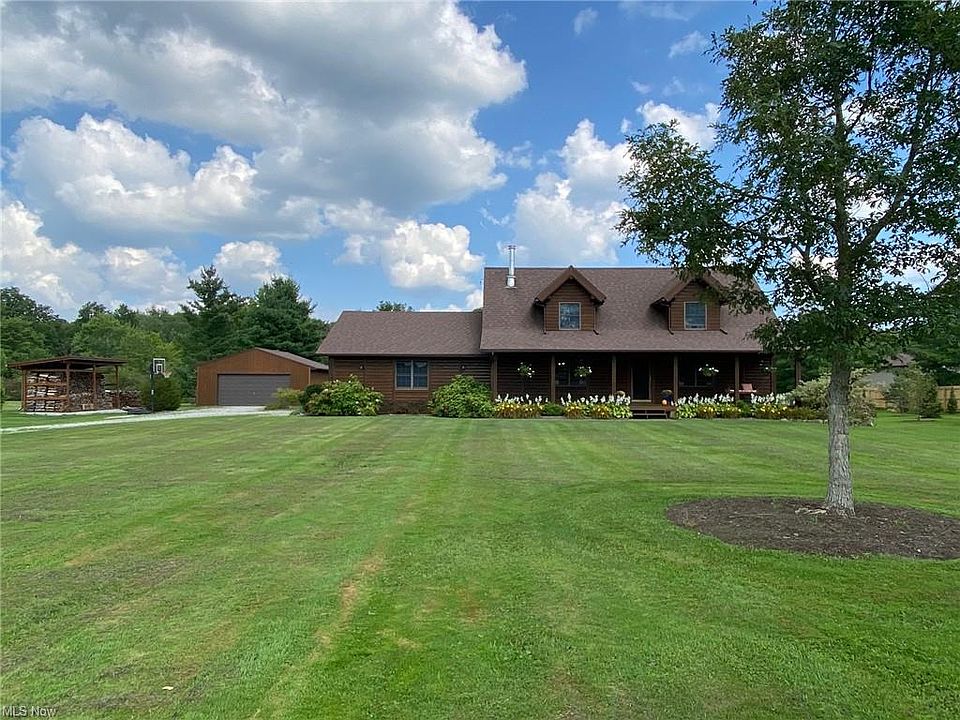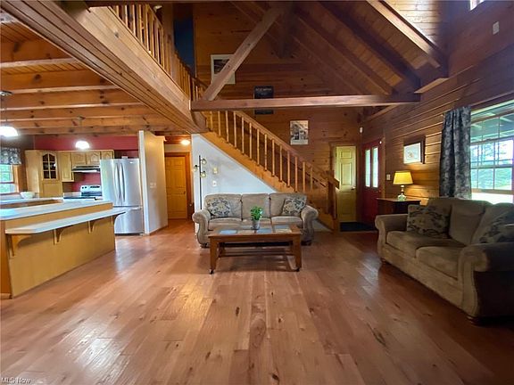 RETREAT to the Country to this Beautifully Maintained Cedar Log Home nestled on nearly 9 Acres! This warm and inviting Cape Cod offers great living space with flat log interior walls and desirable open floor plan. The full length covered front porch with swing welcomes you into the vaulted Great Room with tongue and groove beamed ceiling and wood burning stove for additional heat source. Eat-in Kitchen with center island breakfast bar, stainless steel appliances and dining area with additional cabinetry and counter work space. New carpeting in first floor Master Bedroom and throughout the second floor. Large loft area is open to the Great Room below. 2 additional vaulted bedrooms with large full bath to share. First floor Laundry Room. New custom blinds. Full partially finished basement includes Rec/Playroom with plenty of storage. Roof replaced in 2013. Oversized 2 car attached garage plus 24x24 detached garage and wood shed. Nicely landscaped and manicured yard with mature plantings. Relax and enjoy the views from the deck and brick patio overlooking peaceful backyard. Berkshire Schools.