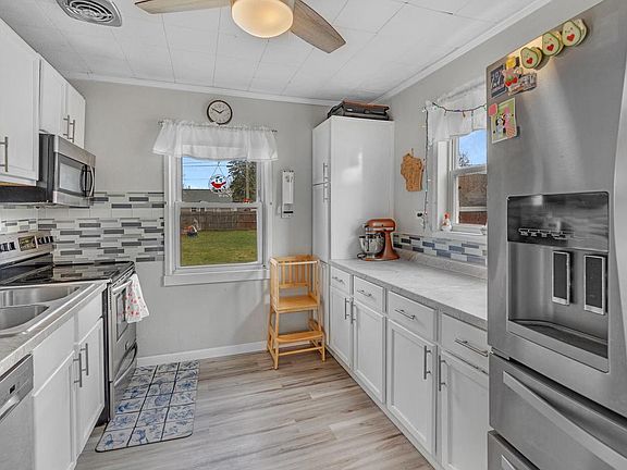 Bright functional kitchenDining areaLarge fenced in backyardLandscaping updatesWildflower garden