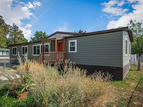 This single-level 3 bedroom, 2 bath manufactured home features a large rear deck, a covered front entry, and an enclosed yard with raised veggie planter beds.