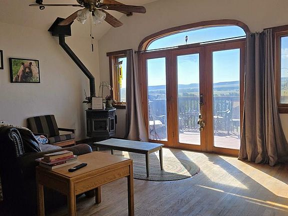 Panoramic viewsLarge sunroomPion and juniper treesWalk-out deckWood-burning stovesDetached two-car garageRolling terrain
