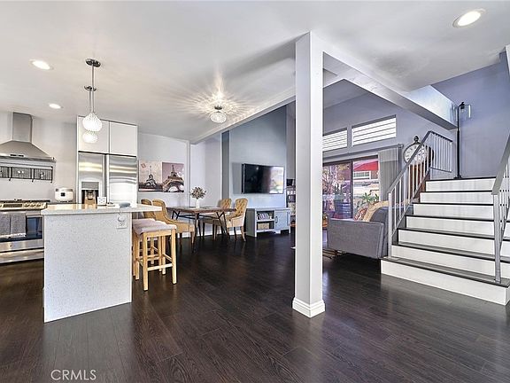 Modern comfort meets everyday convenience in this beautifully upgraded, end-unit condo nestled in one of La Habra’s most desirable communities. With only one shared wall, this home offers added privacy and a light, airy feel throughout. Step inside to discover soaring ceilings and rich dark laminate flooring that create a warm and inviting atmosphere from the moment you enter. The open-concept layout flows seamlessly into a fully renovated kitchen featuring sleek European-style custom cabinetry, including a hidden lazy Susan for added storage and functionality. The spacious island doubles as a breakfast bar and is topped with speckled quartz countertops, complemented by a full suite of stainless-steel appliances including a cooktop, oven, refrigerator, and dishwasher—making this space both stylish and practical for everyday living or entertaining. Upstairs, the spacious primary suite provides a peaceful retreat, complete with an adjoining loft area ideal for a home office, reading nook, or personal gym. The en-suite bathroom has been tastefully remodeled with a floating dual-sink vanity and a luxurious jet shower. The guest bathroom mirrors the same modern finishes with a matching floating vanity. Throughout the home, updated window coverings—including sleek zebra blinds—add a stylish finishing touch while allowing for flexible light control and privacy. For year-round comfort, energy-efficient mini split systems have been installed to cool the entire home with ease. Residents also enjoy access to community amenities, including a sparkling pool and spa—perfect for unwinding at the end of the day. Ideally located near Trader Joe’s, Sam’s Club, Walmart, and a wide variety of local dining and shopping options, this home combines modern living with unmatched convenience. Move-in ready and beautifully updated, this La Habra gem is ready to welcome you home.