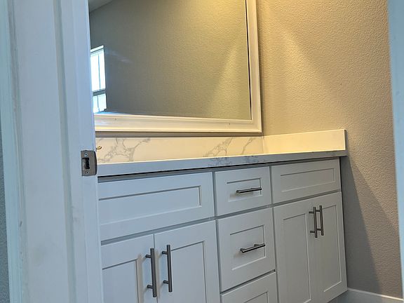 The primary bath offers a spa feel with a dual-sink vanity, framed mirrors, and a separate soaking tub and glass-enclosed shower. Additional bathrooms and the dressing/vanity area are fully updated with matching cabinets and counters for a cohesive design. Generous cabinet storage, easy-care finishes, and abundant natural light make everyday living effortless.