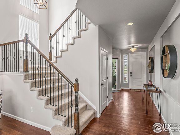 *New Roof 2022 with transferrable warranty, new water heater in 2022, and solar panels paid off! Stunning Corner-Lot Home with Mountain Views in Coveted Candelas! Perfectly positioned on a spacious corner lot, this beautifully upgraded 4-bedroom, 4-bathroom home (5th bedroom could be added, currently storage) fronts to serene open space, a peaceful community pond, and showcases breathtaking mountain views from nearly every room. Step inside to discover bright, open living spaces flooded with natural light. The main level features gleaming hardwood floors, a private home office, and a seamless flow from the gourmet kitchen-complete with granite countertops, stainless steel appliances (including a gas range), and a center island-into the inviting living and dining areas. Upstairs, the expansive primary suite is a true retreat with a luxurious 5-piece bathroom, soaking tub, walk-in shower, and a generous closet. The fully finished basement adds even more living space, offering a stylish guest suite, a home theatre area, a dry bar with wine cooler, and ample storage. Designed for both relaxation and entertaining, the professionally landscaped backyard boasts a covered stamped concrete patio, a charming pergola, and an automatic sprinkler system for easy maintenance. With neighbors on only two sides, you'll enjoy extra privacy and tranquility. Additional features include an oversized garage (roomy enough for a full-sized truck), a second refrigerator, built-in storage shelving, a radon mitigation system, and a fully paid-off solar system to keep energy bills low. Located in the vibrant Candelas community, you'll have access to two resort-style pools, fitness centers, six parks, and over 16 miles of interconnected trails-right outside your front door. This home has it all-style, space, upgrades, and unbeatable views. The only thing missing is you!