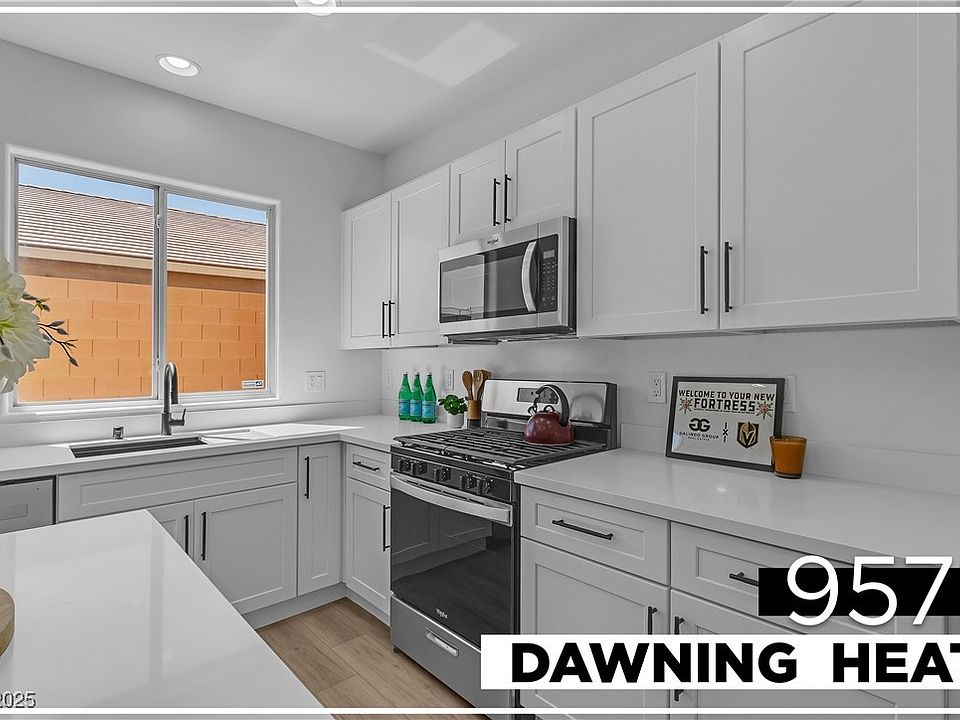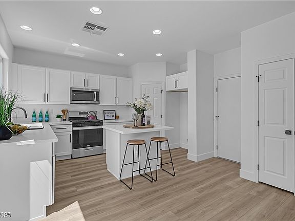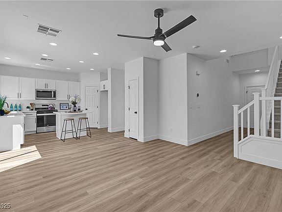 Welcome to your beautifully reimagined 3-bedroom, 2.5-bathroom home in the highly sought-after Mountains Edge community. Step inside to soaring vaulted ceilings, fresh paint, and new luxury plank flooring paired with new carpet for modern comfort. The stunning kitchen showcases a brand-new quartz island, stainless steel appliances, custom cabinetry, and sleek finishes designed for both style and function. An open-concept layout flows seamlessly into the dining and living areas, enhanced by new baseboards, updated lighting, and ceiling fans—perfect for gatherings or quiet evenings. Upstairs, retreat to the expansive primary suite featuring a spa-inspired en-suite with a Roman soaking tub, new fixtures, and ample closet space. With no side neighbors, a full two-car garage, and a low-maintenance backyard ready for outdoor living, this home blends elegance with convenience. Ideally located near top-rated schools, shopping, dining, and freeway access—Mountains Edge living at its finest.