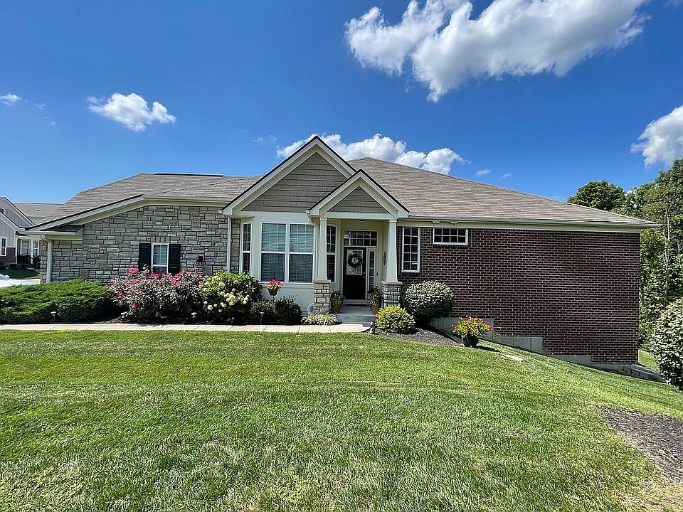 End unit with two covered porches with a wooded view. Kitchen with granite countertops, tile backsplash and wood flooring. Big master suite with big bathroom. Custom shelving and bench with a bay window in the office. Finished lower level has media room and large family room. Freshly painted through out. MUST SEE! MOVE IN READY!