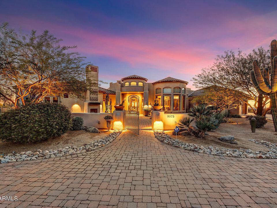 Fabulous custom home on 2+acres exuding SW charm. Views of Pinnacle Peak, mountain and city light views from almost every room! Single level with open floor concept. Heart of the home is the Great room with Gourmet Kitchen Dining area that all lead to multiple patios. The backyard oasis boasts lovely views with a renovated heated pool & spa, waterfall, fire pit, large artificial turf area and built in BBQ.Front patio has exceptional views of Pinnacle Peak and great space for entertaining or just hanging with family. Sunrise and Sunsets are stunning! Media room has wet bar, office with murphy bed,Large Primary bedroom with 2 walk in closets + additional area could be office or exercise room.