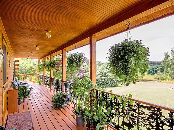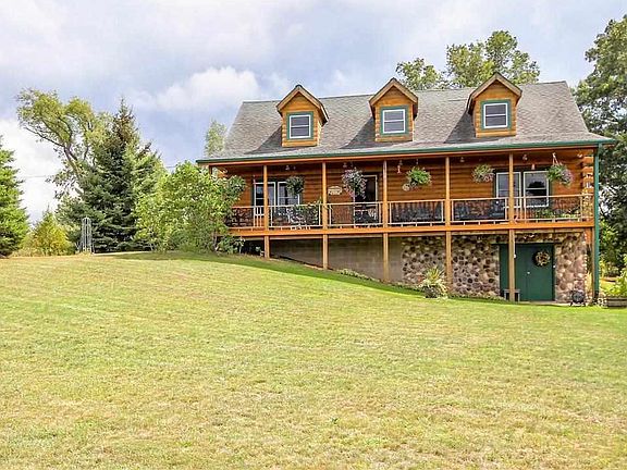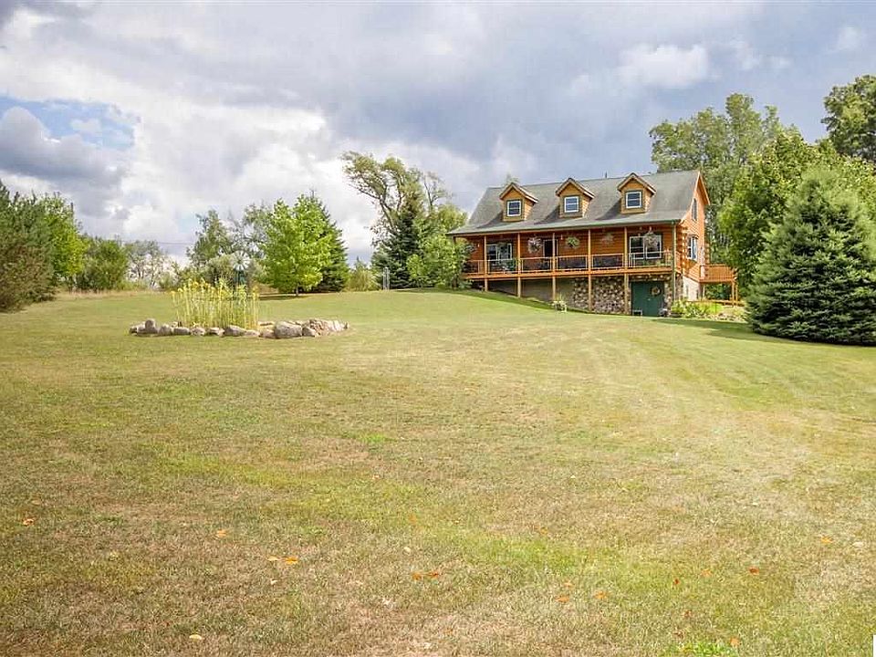 Incredibly beautiful and well maintained 2 story log home offering 3BR/2.5BA on 10.10 acres. Enter the large foyer through the back of the house. Let your dinner guests know dinner is served with the dinner bell off the kitchen. Kitchen has a large pantry. Open living room to formal dining area. Upstairs has loft and 2 bedrooms. All bedrooms have large walk-in closets. Main floor master with jetted tub. Basement has 9' ceilings, block windows and has been plumbed for an additional bathroom. Watch the sunset from the nice deck with wrought iron fencing. Enjoy the Monarch butterflies that the milkweed attract. Grab your backpack and enjoy a peaceful walk on the mowed trails on the property. Extra large septic tank that was pumped in 2016. Shed, firepit. 200 amp service. Reverse osmosis system.