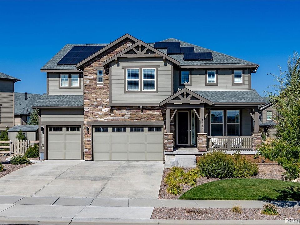 Discover your perfect home in the highly sought-after Sterling Ranch community, where comfort and style come together seamlessly . From the moment you arrive, the charming covered front porch and beautiful curb appeal invite you in. Inside, the home welcomes you with soaring ceilings and a grand two-story great room filled with natural light—a perfect gathering space for friends and family. The gourmet kitchen is both functional and stunning, boasting an oversized island, stainless steel appliances, a gas cooktop, double ovens, 42-inch cabinets, and granite countertops. A butler’s bar and large pantry add practicality and style. Engineered hardwood floors throughout the main level and plantation shutters elevate the home’s timeless design. The main floor office offers flexibility as a fourth bedroom, complete with a ceiling fan and convenient proximity to an updated full bath with granite finishes. Upstairs, a versatile loft area makes an ideal reading nook or play space. The primary suite is your personal retreat, featuring a large walk-in closet, attached laundry area, and a luxurious 5-piece en-suite bath with dual sinks and elegant tile work. Two additional bedrooms share a stylish Jack-and-Jill bath, ensuring privacy and space for everyone. Step outside to enjoy a backyard oasis with an oversized and covered composite deck w/privacy shades, overlooking a beautifully landscaped , large yard with a calming water feature. Relax year-round in the relaxing hot tub, while paved walkways and a storage shed add convenience. The oversized, insulated 3-car garage offers built-in cabinets, a sink, and an access door for added functionality. A full basement awaits your personal touch, offering endless possibilities for customization. This home is thoughtfully designed for immediate move-in, combining luxury, comfort, and practicality. With so much to offer, this incredible Sterling Ranch property won’t last long. Schedule your showing today and make it yours!