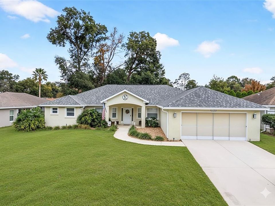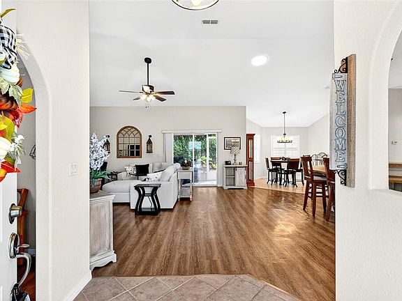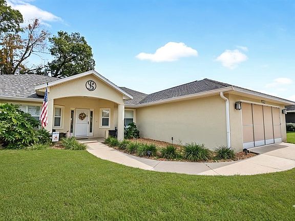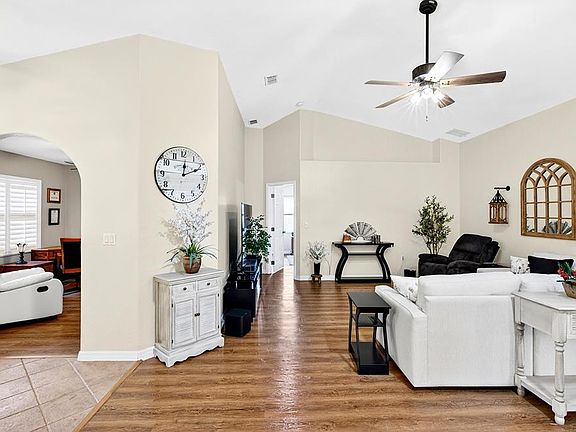 One or more photo(s) has been virtually staged. GATED, HARDWOOD TRAILS A 55+ COMMUNITY FEATURES OPEN FLOOR PLAN, CONCRETE BLOCK HOME WITH PRIVATE BACK COVERED LANAI WITH PRIVACY SCREEN. FRONT PORCH LEADS FOYER OPENING TO DEN/OFFICE ON LEFT WITH PLANTATION SHUTTERS(WHOLE HOME) STRAIGHT AHEAD SPACIOUS LIVING ROOM WITH VAULTED CEILINGS AND TO RIGHT THE FIRST OF 2 DINING AREAS. THE FOCAL POINT OF THE HOME IS THE KITCHEN OVERLOOKING ALL OF THESE AREAS FEATURING, STAINLESS STEEL APPLIANCES, CUSTOM BACKSPASH AND MASSIVE ISLAND WITH ROOM FOR 8 8 BAR STOOLS. BEHIND THE KITCHEN ARE THE 2 SECONDARY BEDROOMS SHARING THE SECOND BATH WITH COMBO TUB/SHOWER. INSIDE LAUNDRY ROOM JUST OFF KITCHEN LEADING TO 2 CAR GARAGE WITH EPOXY FLOOR, SLIDING SCREEN, IRRIGATION AND PULL DOWN ATTIC WITH STORAGE. ACROSS THE HOME IS OVERSIZED PRIMARY BEDROOM WITH SITTING ROOM AND PRIVATE DOOR LEADING TO COVERED LANAI.. PRIMARY BATH HAS 2 WALK IN CLOSETS AND HALLWAY LEADS TO GARDEN TUB, GLASS SURROUND DOOR SHOWER AND DOUBLE VANITY. STEPPING BACK THROUGH LIVING ROOM AREA AND THROUGH THE DOUBLE SLIDING DOOR ONTO COVERED AND SCREENED LANAI. JUST OUTSIDE THE LANAI IS 12 X 12 PATIO WITH PRIVACY FENCE DIVIDER. BACKYARD HAS TALL SHRUBS FOR ADDITIONAL SEPARATION. HOME HAS 2024 30 YEAR ARCHITECTURAL ROOF WITH RAIN GUTTERS. 2024 HVAC, 2024 EXTERIOR PAINT, ALL LIGHTS AND CEILING FANS 2023, AND 2020 INTERIOR PAINT. ALL IN A LOW MONTHLY HOA OF $271 A MONTH WITH ACCESS TO COMMUNITY POOL, CLUBHOUSE AND CLUBS. LIBRARY NEXT DOOR AND NEW PUBLIX SHOPPING CENTER A STONE THROW AWAY!