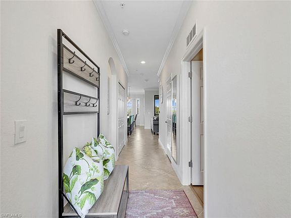 DON'T MISS this impeccable 2-bedroom, 2-bathroom condo located on the top 4th floor in the prestigious gated community of Treviso Bay. Offered turnkey furnished, this condo features the convenience of a common elevator, enhanced privacy as an end unit, & a serene rear SE exposure. With no adjacent neighbor on 1 side & 2 screened openings for both back & side lake views, the home captures peaceful sunrises, the deepest part of the lake, a tranquil fountain & lush preserve surroundings. Upgraded screened-in lanai w/ No-See-Um screening & a screened front door enhance airflow throughout the unit. The interior has been freshly painted & showcases a bright & open great room floor plan w/ crown molding, plantation shutters & updated lighting fixtures in the bathrooms. There is even a pull-out couch in the living room! The all-white kitchen is equipped w/ quartz counters, a newly installed white subway tile backsplash, stainless steel appliances, an oversized island, eat-in kitchen & a spacious pantry—perfect for both everyday living & entertaining. Smart home features include a Ring doorbell & Honeywell thermostat for enhanced convenience & security. Flooring includes elegant tile throughout the main living areas & NEW luxury vinyl plank flooring in both bedrooms—completely carpet-free! The primary suite offers 2 walk-in closets & a beautiful en-suite bathroom w/ white cabinets, quartz counters & a tiled walk-in shower. The guest bathroom features white cabinets & quartz counters, along w/ a shower/tub combination. Additional highlights include impact-resistant windows & doors, an in-unit laundry room w/ wire shelving, a private outdoor storage closet, a covered carport space & ample guest parking. A social membership is included where residents can enjoy Treviso Bay’s world-class amenities that take this property to another level of luxury living. A satellite pool w/ loungers & pickleball are just up the street for easy access. Enjoy a full range of activities including: 18-hole championship golf course designed by Arthur Hills (social members can golf May-Oct), 8 lighted Har-Tru tennis courts w/ a tennis center & pro shop, bocce courts, basketball courts & pickleball courts for active outdoor fun. Residents enjoy 2 private clubhouses—the 64,000 sq ft main clubhouse w/ fine dining, library, card rooms, billiard room & the 15,000 sq ft Villa Rilassare w/ a poolside bar & restaurant, fitness amenities including a fitness center, pilates & aerobics studio & full-service spa w/ a beauty salon & sauna. Multiple pools include a resort pool, kids pool & lap pool. Numerous social activities for all interests! Treviso Bay offers 24-hour guard at the gate for additional security & is ideally located near the best of downtown Naples, including shopping, dining & entertainment options. With its exceptional amenities & prime location, this move-in ready condo provides the perfect opportunity to live the life you've always dreamed of in Treviso Bay!