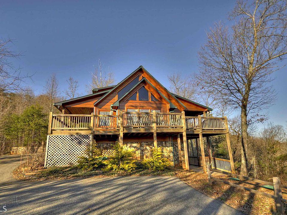 Tucked Away in Prime Area ..Quaint Long Range Mtn View Cabin...whimsical and welcoming 3bedroom/3bath log charmer exudes fun & relaxation! Situated on private 3+ acre wooded tract overlooking long range views, large covered porches, party porch w/ FP & hot tub, soaring ceilings & stone FP in great room, kitchen boasts plenty of cabinets & granite counters + bar area, master opens to "sleeping balcony" and large bath with walk-in shower & soaking tub, loft reading nook/office, large closets throughout, full finished terrace level has cozy guest quarters along with den/rec room & wet bar, fabulous firepit & roomy outdoor area is great for entertaining, plentiful parking area w/ nearly all paved access, close to historic Blue Ridge & Ellijay.