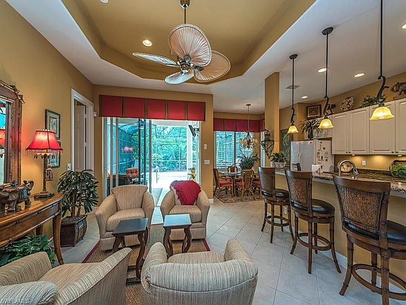 H.10579 - Sure to impress you is this meticulously maintained 3 bedroom plus den home located in the gated community of the Vineyards. The home has been updated with granite counter tops in the kitchen, updated pendant lighting over the breakfast bar, updated master bath fixtures, frame less master shower door, & new AC in 2015. Additional updates include master bedrm carpet, new Frigidaire SS dishwasher, under cabinet lighting. The layout features a large living room plus additional sitting area for cocktails with views of pool area. The kitchen features 42" upper cabinets for lots of storage, raised breakfast bar, large eat-in kitchen. The finishes included ceiling fans, plantation shutters in all the rooms, rounded arched doorways, tray ceilings, ceramic tile through out foyer, kitchen and living areas. Master Bedroom has a box bay window with views of pool, and dual closets. The master bath features dual raised vanity sinks, large walk-in shower, & separate soaking tub. Lush private backyard oasis has caged pool and privacy, & partial pond view. Additional storage with pull down attic in 2 car garage. Vineyards Golf Membership/Social is optional. Lots of walking/biking trails.