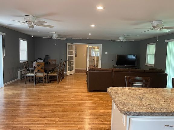 The combination kitchen, living room, and dining room area features two glass doors that access a porch on the front as well as the one on the backside of the house.