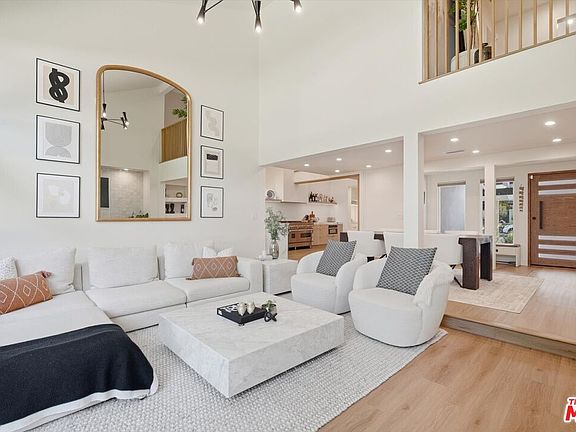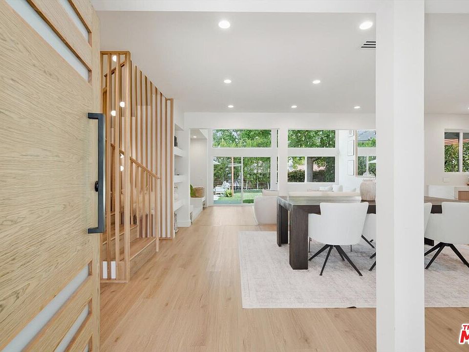 Positioned on a corner lot in the coveted Village Homes neighborhood, this reimagined 4-bedroom, 3.5-bath residence perfectly balances modern design with California comfort. Blending clean, contemporary lines with mid-century warmth, every inch of this home has been thoughtfully curated to create a seamless indoor-outdoor flow ideal for both everyday living and entertaining. Step through the dramatic walnut front door into an airy, open-concept main level where natural light pours through floor to ceiling windows and doors, illuminating the designer finishes throughout. The kitchen, dining, and living spaces connect effortlessly anchored by a sculptural floor-to-ceiling clay tile fireplace and custom white oak staircase crowned with an 18-foot handcrafted chandelier. Sleek custom cabinetry, floating wood shelves with under-lighting, and stainless steel appliances lend the kitchen a timeless yet modern edge, while the powder bath offers a bold, moody counterpoint with reclaimed wood, smoked mirrors, and designer fixtures. Two primary suites one conveniently located on the main level and another upstairs offer flexibility for multi-generational living or a luxurious guest retreat. Each suite features spa-like bathrooms with bespoke tile work, double vanities, and spacious walk-in showers. Two additional upstairs bedrooms share a beautifully appointed Jack-and-Jill bath. Outdoors, the backyard has been transformed into a serene private retreat designed for relaxation and entertaining. A new pergola shades the dining area and BBQ, while stone hardscaping, expanded planters, and a tranquil fountain set the tone for quiet evenings under the string lights. The cozy seating area complete with umbrella and lush greenery makes this the perfect setting for wine nights, dinner parties, or peaceful afternoons in the sun. The side yards have been refreshed with stone pathways, offering a clean, cohesive aesthetic from every angle. Located just moments from Westlake's shops, dining, and scenic walking trails, and within the highly sought-after Village Homes community featuring a pool, kiddie pool, tennis courts, and clubhouse. This home is the complete package: modern sophistication, functional design, and the effortless Westlake Village lifestyle.