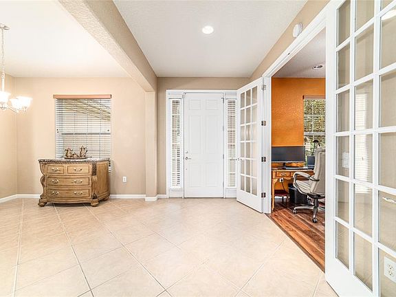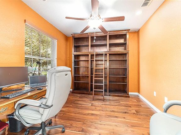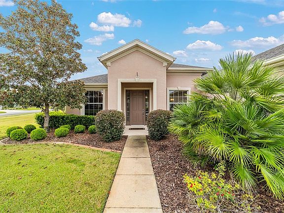 Welcome to this well-maintained Johnstown model featuring 3 bedrooms, 2 baths, den/office, 2 car garage, plus golf cart garage in the sought-after Buckhead neighborhood. Situated on a landscaped corner lot in Del Webb’s 55+ community of Stone Creek. With 2,122 sq ft of living space, this home offers both comfort and functionality in a resort-style setting. Step inside to discover hardwood floors in the private den/office with French doors and spacious primary bedroom, ceramic tile throughout the main living areas, kitchen, and bathrooms, and new carpet in the two guest bedrooms. The open concept includes a chef’s kitchen with easy-care Corian countertops, stainless steel appliances, abundant cabinetry with pull-outs and counter space, an island for additional prep space, perfect for entertaining. Ceiling fans throughout the home add to the comfort. The split-bedroom floor plan ensures privacy, with the primary suite featuring a luxurious primary bathroom with dual sinks, a garden tub, a separate shower, and a walk-in closet. Additional highlights include an inside laundry room, an enclosed lanai featuring Berber carpet, sunshades that provides a cozy space to enjoy year-round. A separate screen lanai leads to a patio with granite table, chairs and cushions that convey expanding the outdoor living space. The fenced backyard is ideal for pets. The garage includes overhead storage with pulldown stairs. The Bookcase in the den/office conveys. An EZ Go Golf Cart (2-seater) may be purchased outside of the contract. Stone Creek offers an abundance of clubs and activities. The Elan Spa features state-of-the-art cardio and strength equipment, indoor heated pool with lap lanes, sauna and steam rooms. The Reunion Center offers a Ballroom with Stage, Craft room with kiln, card/multipurpose rooms, Café, full size Community Kitchen. The new Stonewater Clubhouse offers Golf Stimulation, Amphitheater, Shuffleboard and more. Outdoor enthusiasts will appreciate the softball field, resort-style outdoor pool and hot tub, pickleball, bocce ball, basketball, and tennis courts, and so much more! Conveniently located to shopping, restaurants, and medical facilities. Don’t miss this opportunity!