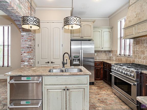 ONE-OF-A-KIND home in The Oaks of Zachary custom built by the developer himself! Exquisite features of the original home + ‘Smart’ upgrades made by the current owner, this is truly a unique opportunity you won’t want to miss! Freshly painted interior, 10’ ceilings, crown molding, and designer slab granite throughout. A stunning brick archway frames the kitchen and dining area with “Old Brick” flooring in each. Gourmet kitchen features DCS industrial grade oven with 6 burner gas cooktop, pot filler, custom hood, stainless double drawer dishwasher, huge pantry and refrigerator to remain. Absolutely gorgeous Antique Hart of Pine flooring in all other living areas. Built-in bookcase, entertainment center, and an elegant mantle encases gas fireplace in Family room. Stained glass windows in the bathrooms, and the additional bedrooms are split from the Primary suite. Master bath is a must-see! Oversized separate vanities with plenty of cabinetry, 2 walk-in closets, 4 foot tiled shower, & water closet all centered around a Whirpool tub with a double-sided fireplace above. Laundry room has double uppers, an office workspace, & 2020 Samsung Washer/Dryer included. Enjoy the privacy of a fully fenced yard and lush landscaping on the spacious back patio. There’s an additional side patio that mimics a New Orleans-style courtyard with heat resistant exposed wood ceiling, equipped with a gas line for that outdoor kitchen you’ve always dreamed of. Newly Epoxy-coated floor & double reflective insulation added in the garage, a 130sf storage room, & access to the 2nd attic. Additional upgrades: Water heater (2020), AC routinely serviced, Nest Smart thermostat, rain gutters, inground termite bait system, motion detected flood lights, Ring doorbell & 3 outdoor security cameras. Neighborhood features walking trails, a stocked pond to fish or kayak, and a Play Area for the kiddos. #1 RATED Zachary School District. NO FLOOD insurance required. Come tour this beauty today!