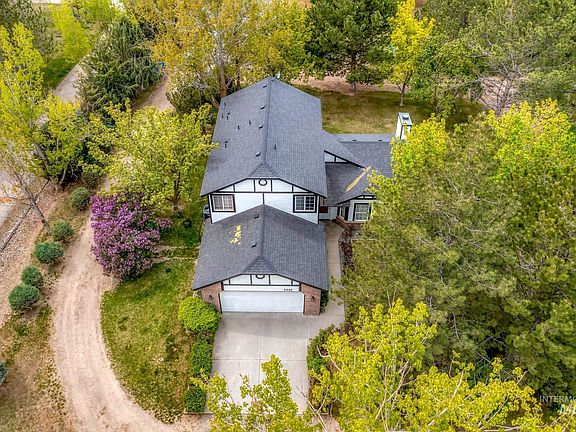 Welcome to your Idahome! Drive down the tree-lined driveway, well away from the road & noise & step into this beautiful 4BD/3BA English Tudor style home sitting on 10 gorgeous wooded acres. Take in the garden area, fruit trees & flowers galore. Cherry hardwood floors in the entry, new LVP downstairs, engineered bamboo floors on staircase & upstairs. Primary+2 beds upstairs, 1BD on main w/additional room for office or enjoying your quiet life. New roof, water heater, furnace, heat exchanger & air handler 2018, Bosch dishwasher 2023, wood burning fireplace w/ fan for efficient heating. Covered patio to watch the sunset & mountain views from the backyard. This property has everything you need for your equestrian or ranch lifestyle including a large arena, circular training arena, 3 barns, stalls, 3 pastures & TEN ACRE FEET OF WATER RIGHTS! This spacious property will also allow an Additional Dwelling Unit up to 1187sf to be built. Close enough to town to feel included, but far enough away to feel secluded.