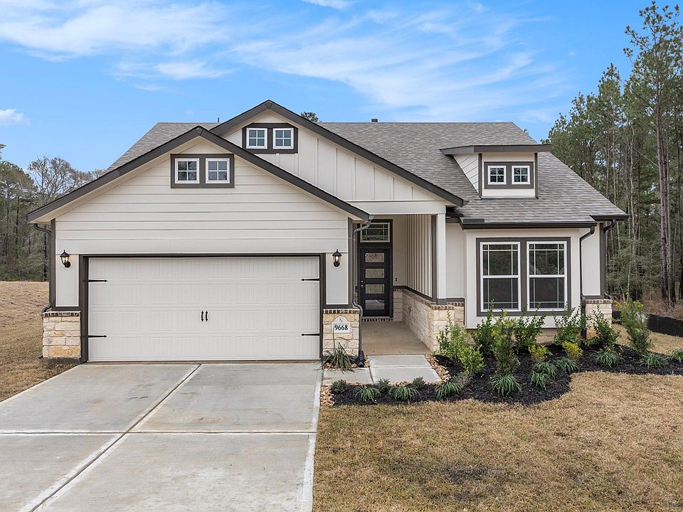 Stunning 1-story home on a 1-acre lot with 3 beds, study & 2-car garage! Features a gorgeous kitchen with double-stacked cabinets, double trash pullout, built-in SS appliances, granite counters, designer backsplash & island overlooking a spacious family room with shiplap fireplace. Farmhouse black lighting and plumbing fixtures add charm. Laminate wood floors throughout (carpet in bedrooms only). Primary suite offers high ceilings, soaking tub, separate shower & dual granite vanities. Secondary bedrooms share a granite double-sink bath. Includes propane, sprinklers, SS appliances & USB/media outlets. Zoned to Willis ISD, low taxes, minutes to I-45 & Lake Conroe!