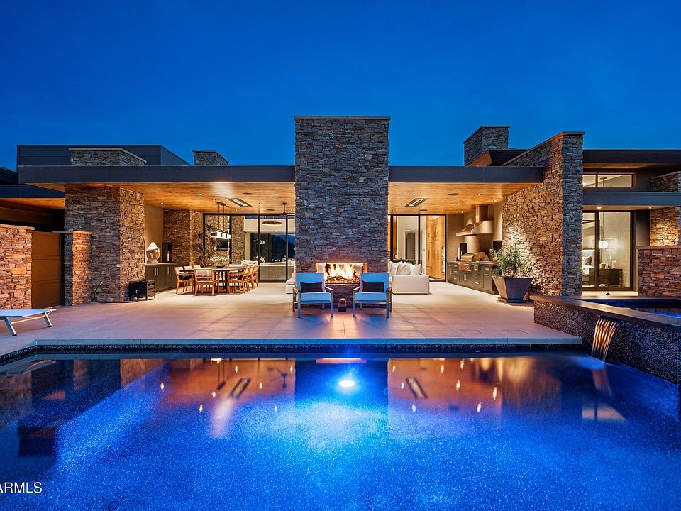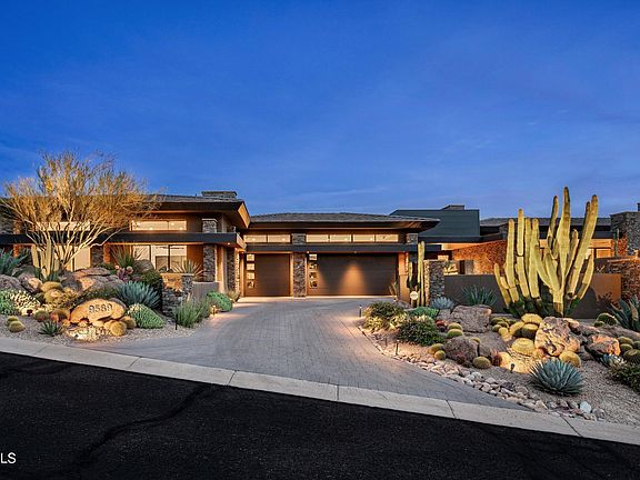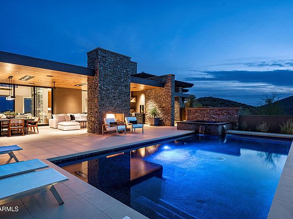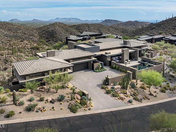 Sophisticated Contemporary Elegance...A very private estate nestled into the pristine desert setting of Cintarosa Ranch, the crowning star of Desert Mountain's upper villages...Surrounded by both near and distant mountain vistas, and convenient to the community's award-winning private 25- mile hiking trail system. The refined interior and exterior architecture by JK Design features a one-level, sleek, low-profile character and utilizes natural elements of stone, glass, wood and steel to harmonize with the Sonoran desert beauty. Exquisite succulent gardens, viewed from each room and patio, exude a Zen ambiance throughout. Each room offers walls of glass with dramatic vistas, while also creating inviting warmth and coziness. The open great room plan anchors the home and resort patios. The smartly appointed foyer introduces a theme of residential elegance, soothing color palette and thoughtfully curated furnishings found throughout the home. The great room features a soaring stone hearth enriched with flanking library shelves, a floor-to-ceiling glass wine center, and glass walls that open to both the north and south entertaining patios, all enhanced by soft light of a sleek, circular chandelier. The chef's kitchen with state-of-the-art appliances and breakfast bar boasts a hidden secondary kitchen and pantry. The nearby dining room offers a built-in buffet and opens to its own large patio that features banco seating surrounding a rectangular fire pit, south valley views, sunsets and city lights. The luxurious master suite and spa bath offer two generous outfitted closets, and a glass shower opening to a private garden. Three well-appointed guest ensuite bedrooms (one currently an office) each offer a private patio and complete the main home.