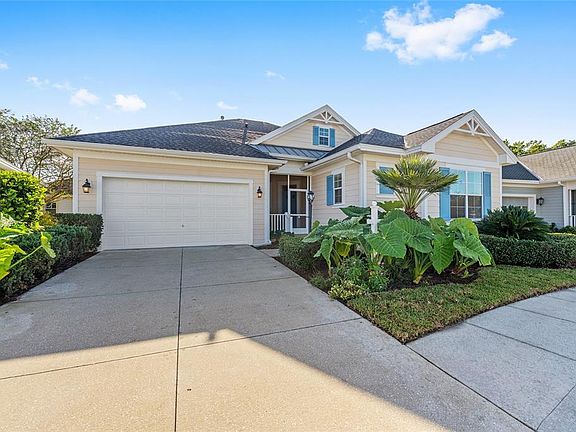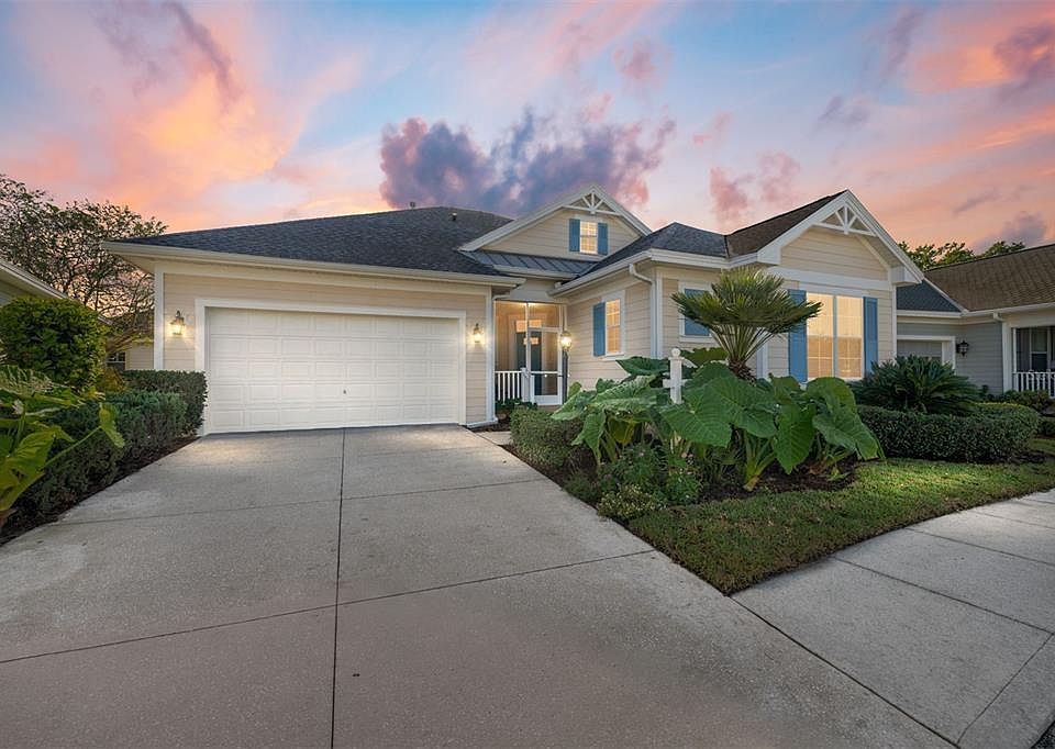 **RARE FIND** This charming TURN-KEY 3-bedroom, 2-bathroom Camden model comes with a spacious 2-car garage and is nestled in the highly desirable LAKE SHORE COTTAGES Village, right next to the lively LAKE SUMTER LANDING! Enjoy a hassle-free exterior with low maintenance and delightful curb appeal thanks to HARDIE PLANK SIDING, plus a lovely SCREENED front porch to relax and unwind. Inside, you'll love the bright and airy open floor plan featuring stunning HARDWOOD flooring throughout the living room, kitchen, and Florida room. The kitchen is a chef's dream with GRANITE countertops, a GAS stove, a handy closet PANTRY, beautiful white cabinets with pull-out shelves, a cozy breakfast bar, and sleek SS appliances. The primary suite offers a generous walk-in closet, dual vanity sinks, a spacious walk-in shower, and a private water closet for extra comfort. The two guest bedrooms at the front of the home include built-in closets, and the guest bath provides plenty of space for visitors to feel at home. Additional wonderful features include an HVAC system (2025), convenient inside laundry, elegant CROWN MOLDING, move-in readiness, ROOF (2022), HWH (2023), and it’s situated directly across from the pool—plus, there’s NO BOND! This is a fantastic opportunity to become part of this highly sought-after community. Whether you're looking for a seasonal retreat, a full-time residence, or a smart investment rental, this home has so much to offer. Plus, it’s within walking or golf-cart distance to Lake Sumter Landing Market Square, where you can enjoy lively shopping, dining, live entertainment, and movie nights—making every day feel like a getaway!
