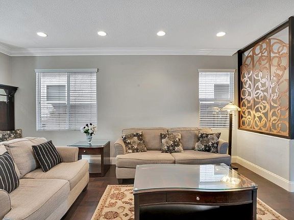 Welcome to the Heart of Brea. 5 min to downtown Brea and the Brea mall. Enjoy the open floor plan fitted with recessed lights, crown moldings, 6.5' baseboards, hardwood flooring, and laminate wood plank flooring. The kitchen is complimented by its antique white cabinetry & a huge center island with custom pendant lights, stainless steel appliances, & recessed sink. Relax with a full bedroom & bathroom downstairs. Follow the elevating stairs up into a large master bedroom with custom recessed ceiling, recessed lights and ceiling fan. Further is an ensuite bathroom comprised of a luxurious sunken tub, travertine floors, along with 2 classy, separated vanities. Discover three additional sizeable bedrooms & a large loft for entertaining. This spacious garage features epoxy flooring, custom built in cabinets, and wall racks. Included in the home are newer appliances such as a washer, dryer, refrigerator. Listed as 5 bedrm due to loft can be converted.