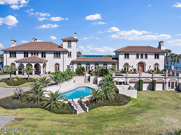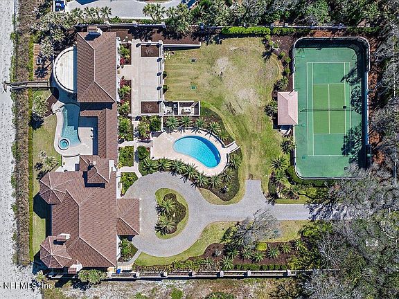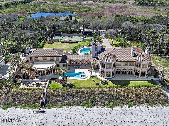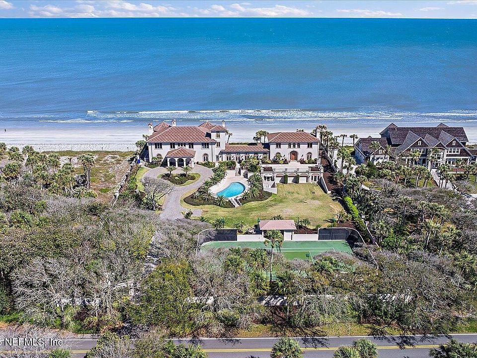 Undoubtedly one of the most impressive oceanfront estates in Ponte Vedra Beach with sidewalks to the beach clubs, this iconic property spans 200 feet along the Atlantic and extends approximately 430+ feet in depth, offering incredible privacy with a gated entrance and fenced perimeter. Surrounded by lush landscaping, this luxury retreat features two beautiful pools—one oceanside for panoramic views and another at the front for breezier days—along with a private tennis court. This estate includes a main residence and a guest house, seamlessly connected by a sunlit gallery. The layout is great for hosting, with plenty of space for guests. The property also has a four-car garage and an expansive parking area, perfect for entertaining (the fourth garage bay is currently finished as a caretaker's suite with a private bath). Inside the main home, the first floor offers 2 guest suites, a spacious kitchen, a dining room, and a bright oceanfront living space. Upstairs, you'll find 3... additional bedrooms, including the oceanfront primary suite, a second living room with amazing views, and a charming third-floor "princess perch" with a unique vantage point. The guest house is fabulous, featuring 2 bedrooms, a full kitchen, a generous living area, and a game room. With numerous extraordinary details, this estate is a rare offering in one of Ponte Vedra Beach's most coveted locations.