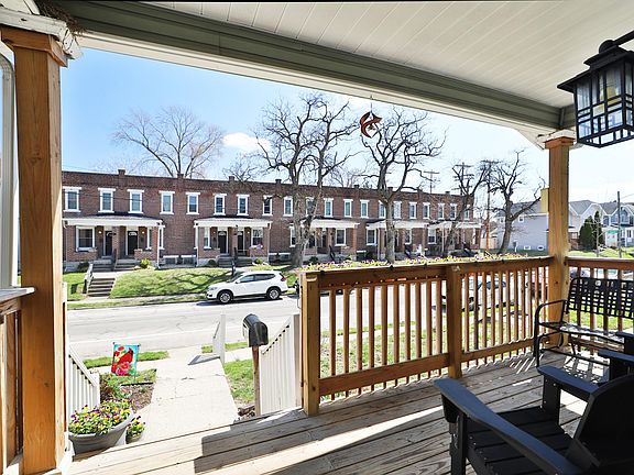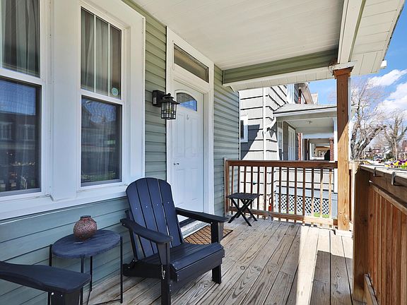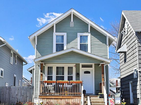 Relax and enjoy the neighborhood from the large front porch of this fantastic 3BR! Light & bright living room with beautiful HW floors, crown molding, and a decorative fireplace. The HW and natural light continue through the dining room! Updated kitchen with granite counters and plenty of cabinet space. Huge pantry can also be converted to a laundry area complete with a washer/dryer hookup. Convenient entry level full bath! Upstairs offers generous sized bedrooms with roomy closets and refreshed full bath. Fully fenced deep backyard with deck and 2 car detached garage! Highlights include: water heater '25, roof '20, windows '20, HVAC '19, new concrete back walk '22, new basement floor poured '22, basement drain and sump pump '20, foam insulation '21.