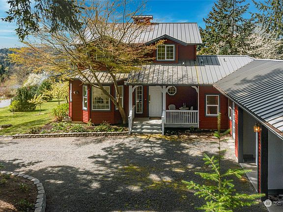 First time on the market in 38 years. This classic red farmhouse is perched high atop scenic Windsong Loop on a large sunny lot overlooking the neighborhood's historic dairy barn and the Olympic Mountains. This rare property boasts mature landscaping, fruit trees and ample garden space. Inside, find three bedrooms with a family room, living room plus a flex room/office, bright sun room and a large shop/maker space. Metal roof and solar panels. This cleared half acre lot is surrounded by another half acre (+/-) of neighborhood common space for a wonderful buffer. Close to Rolling Bay shops and cafes, Ted Olson Nature Preserve, schools and highway access. Bring your ideas and plans to make this very special property your home.